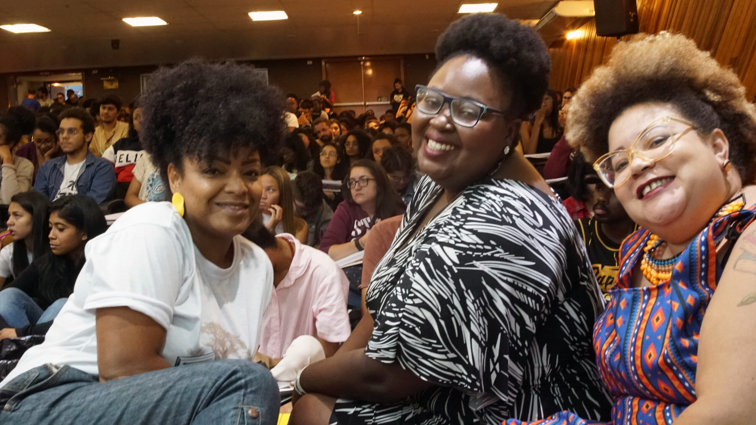 As coordenadoras Fabíola de Carvalho, Mayra Ribeiro e Elaine Correia no aulão inaugural da Uneafro em 2018.